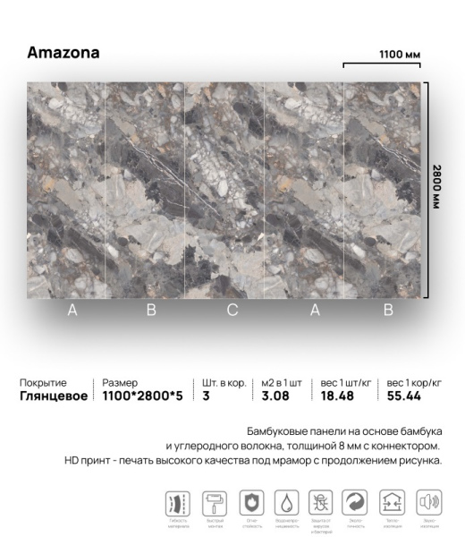 3 варианта дизайна Размеры: 1100 мм × 2800 мм × 8 мм Производство: Китай Материал: композиционный на основе бамбука с добавлением углеродного волокна (карбона) Тип поверхности: глянцевая Основные цвета: бежевый, коричневый, светло-серый Применение: для отделки внутри помещений, для стен, для потолков Вес коробки: 55.44 кг В коробке: 3 шт
